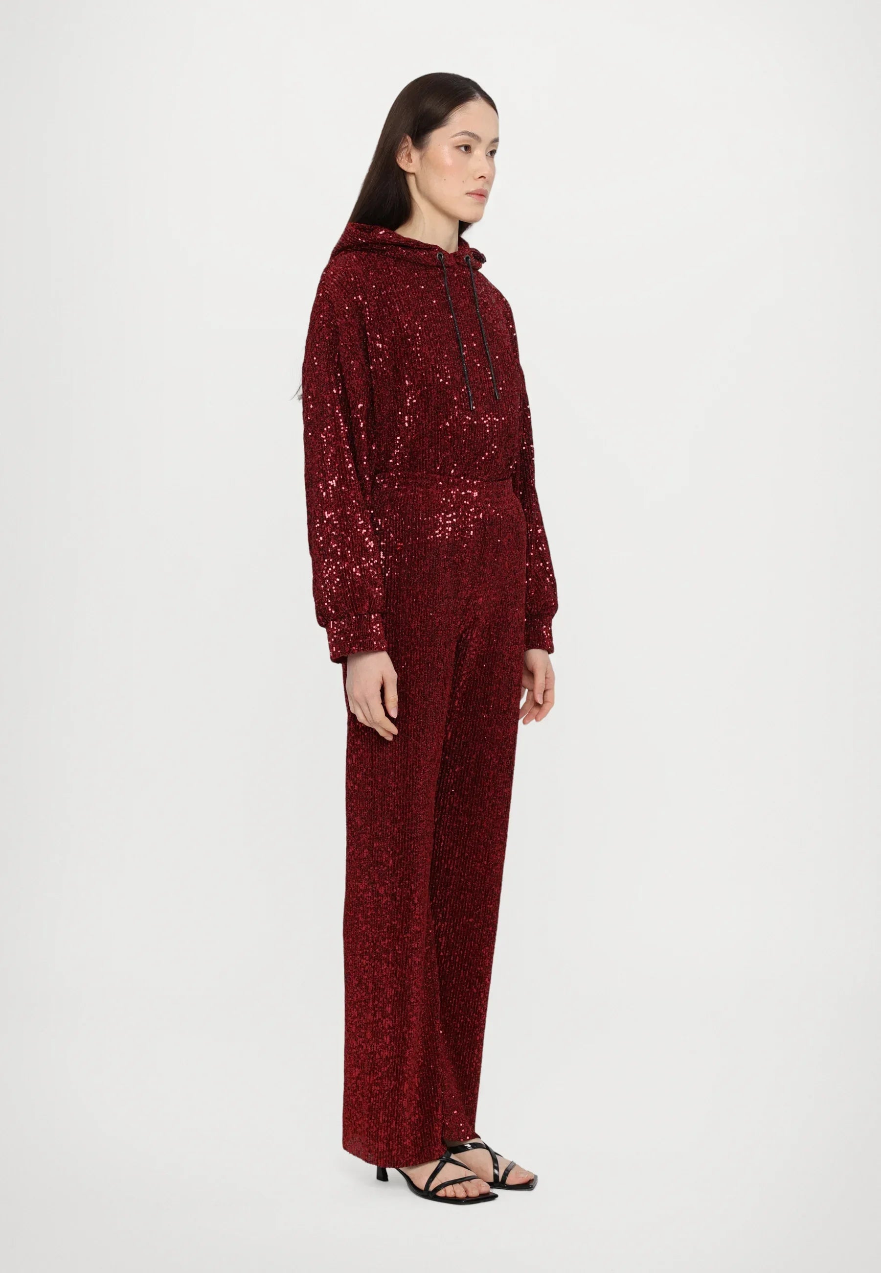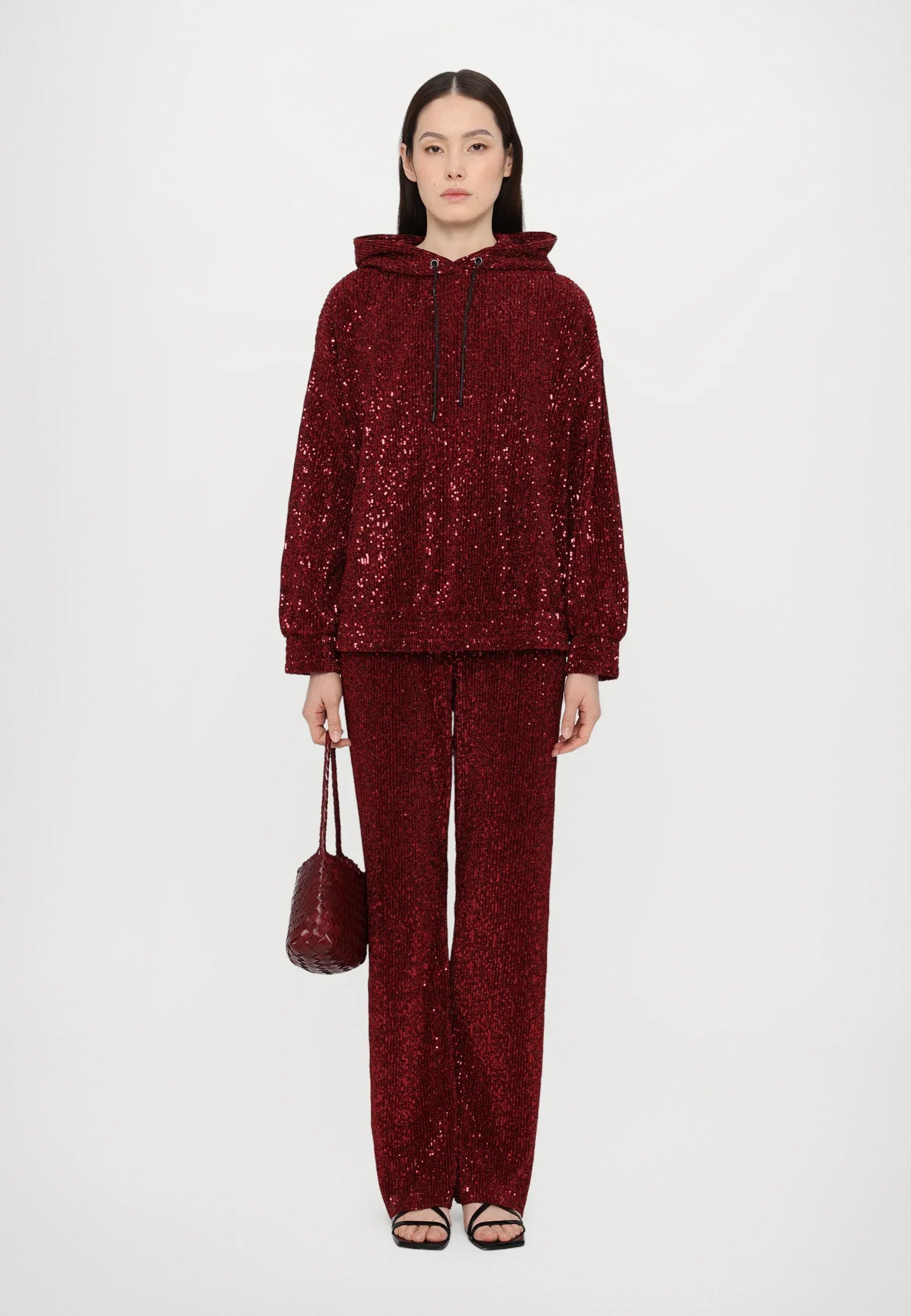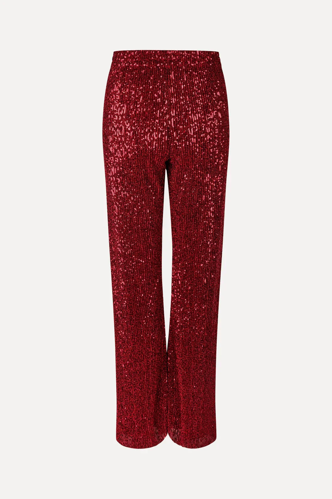 Hér eru á ferð glitrandi og klassískar pallíettubuxur frá Stine Goya sem vekja svo sannarlega mikla athygli með djúprauðum Bordeaux tón sem gefur fínlegt, glitrandi yfirbragð og glæsileika.